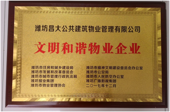 濰坊昌大公共物業(yè)管理有限公司獲“文明和諧物業(yè)企業(yè)”稱號